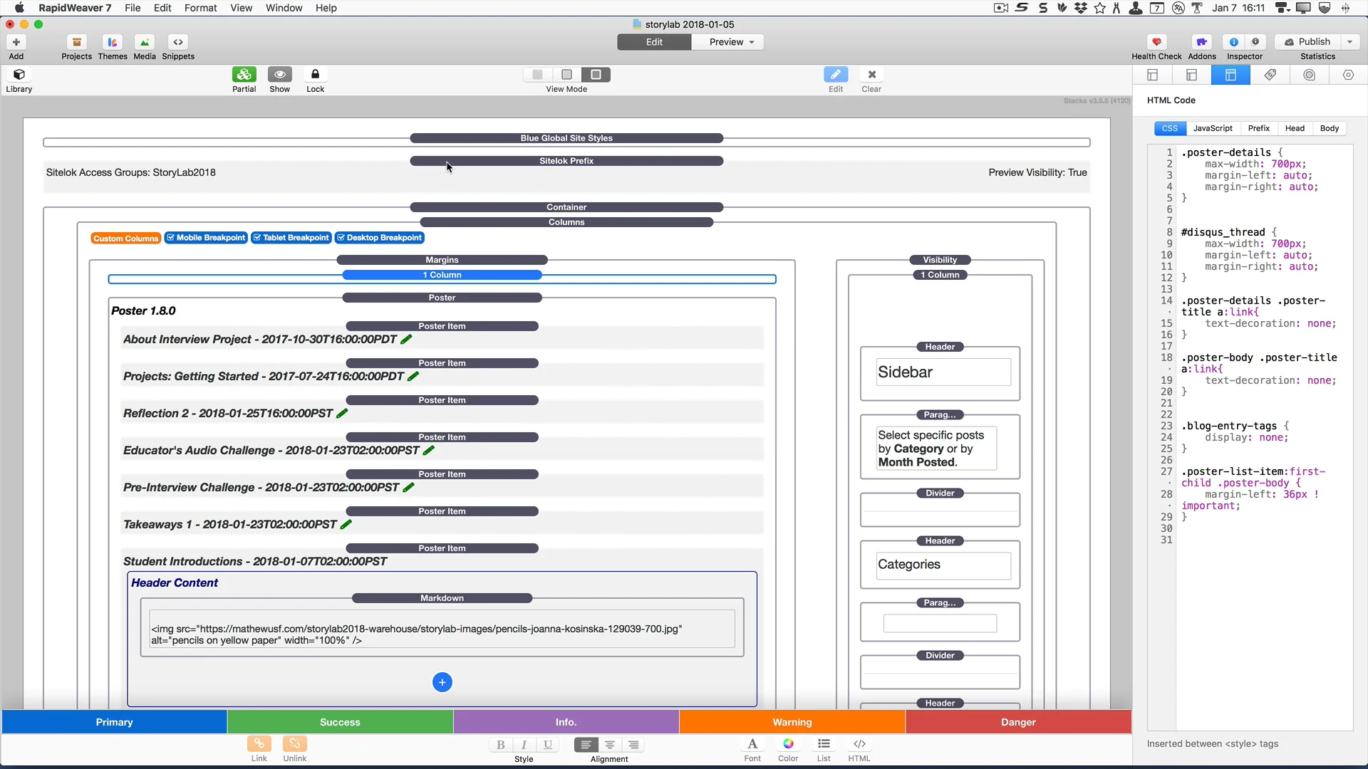 I’m new to Rapidweaver and finding it a steep learning curve (after making my websites on Iweb for years). I like the flexibility with Foundation and so I have been working with it for a week now. I am using it to remake my websites for some philosophy courses I teach at a university. Now I am trying to figure out how to add a blog page and now I’ve come up on this question of using Workman’s CMS blog or Poster Stack. I don’t really understand CMS. It looks like that is useful for companies that have multiple users. I am a single individual so it seems like I don’t really need CMS. Then I found Poster Stack and am considering buying it. It says I need Rapidweaver 7 and Stacks 3.5 which I have. But it also says I need something called PHP 5.6. I don’t know what that is. Now I’m back to wondering if I should just get CMS. In addition to my philosophy course pages I need to rebuild my pages for my ceramic art. (My Iweb pages are still up at http://tfreeman.net/Ceramics/Welcome.html). So my general question is, should I learn CMS? Is it valuable for a single person or is it necessary only for companies with multiple users? And then, if I don’t try CMS, is Poster Stack the best option? And what is PHP 5.6?