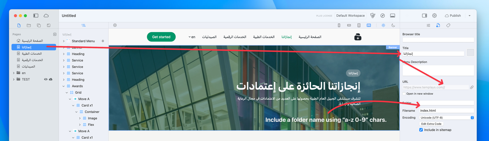 We’ve taken a look at your project and it’s because we don’t/can’t generate Arabic names for folders. So right now, all the folder names are empty, meaning all the Arabic page URL’s are pointing to the root.