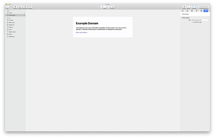 So add an offsite page type to the website. Give the page a name like “Contact Me” and then give it any random link of like https://example.com/ in the Page Inspector.