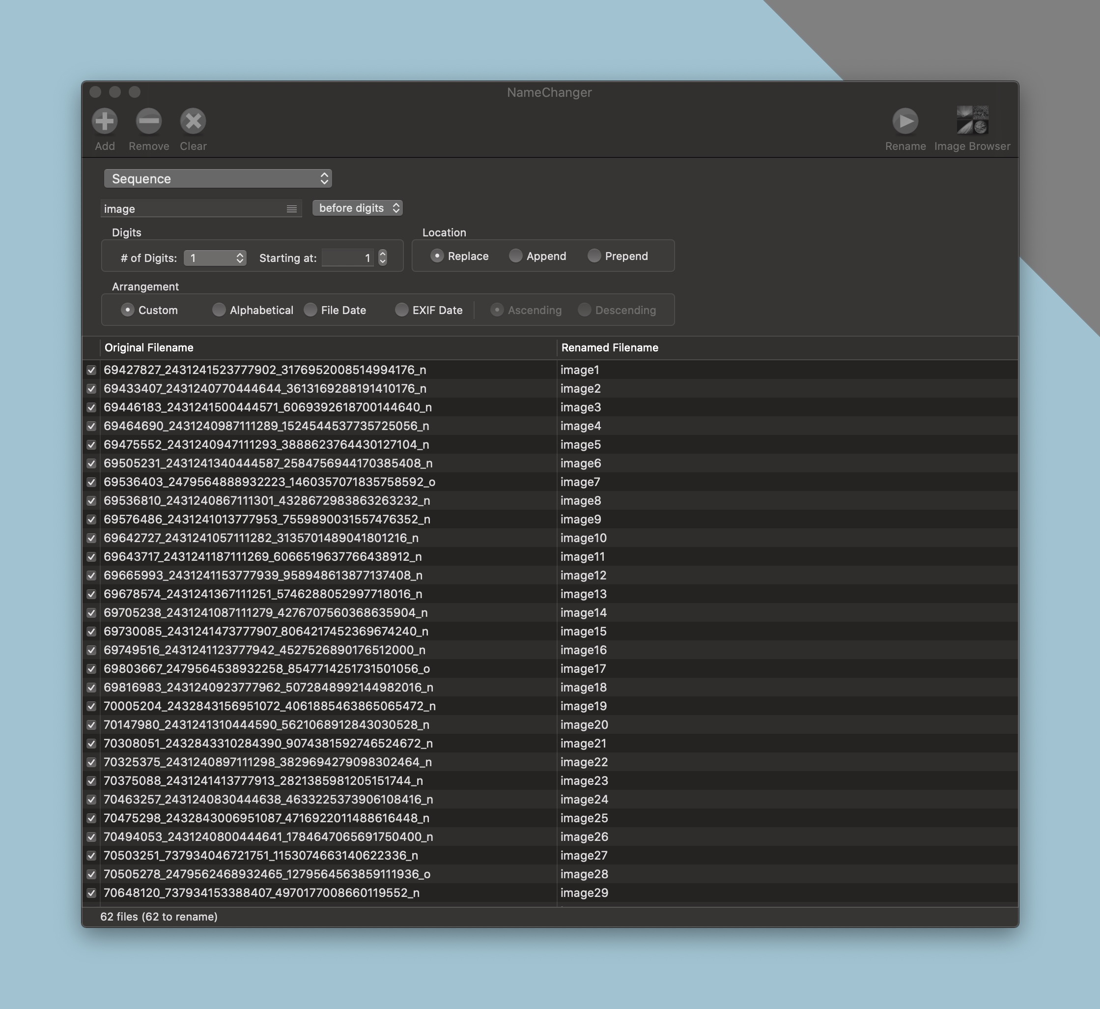 This is Namechanger in action. Note the original file names on the left and the new sequenced file names on the right. That took me all of 5 seconds to do.