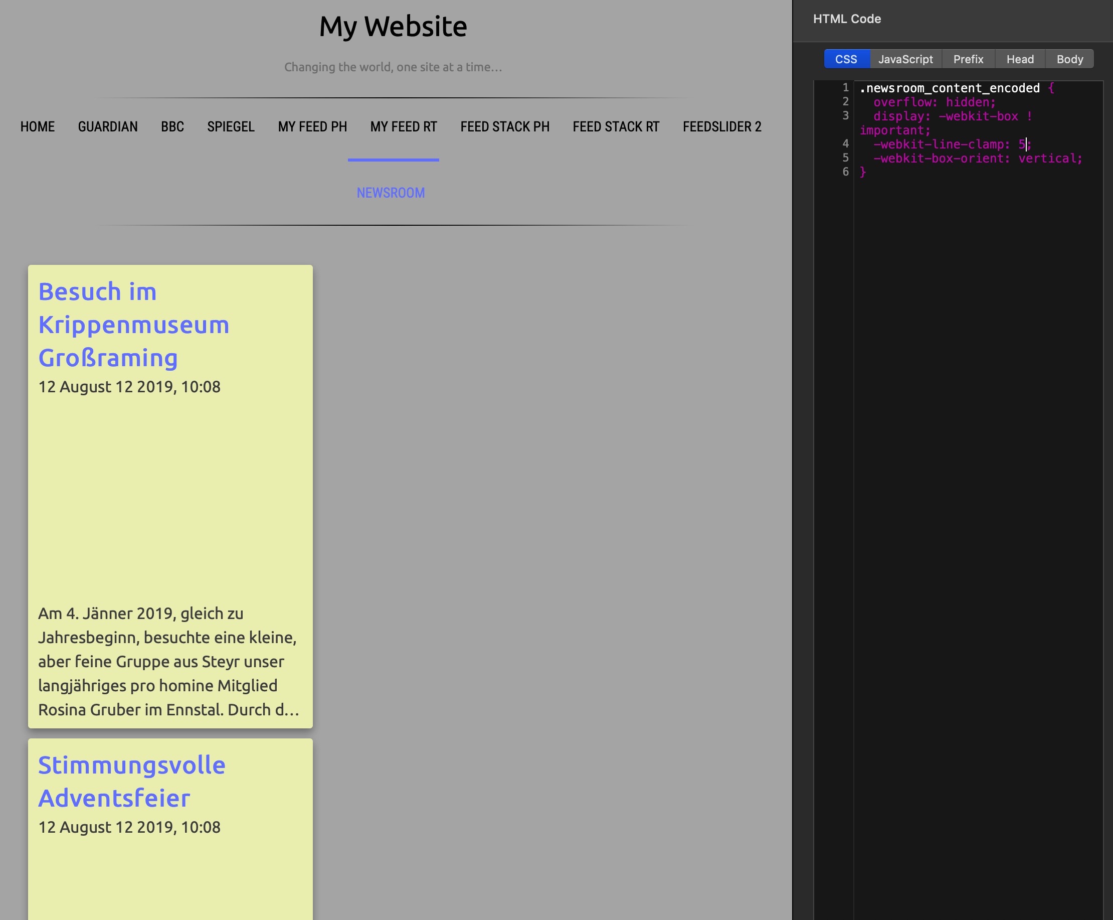 _What I want to do is to import my own blog into the home page of for example this website: http://pro-homine.at. _ Currently I am using the Feed stack from Yuzoolthemes. Since I can’t control the number of news items that I want to show, and also because there are limits with regard to formatting, I bought your new stack. My RSS feed is this: http://pro-homine.at/blog2019/files/feed2019.xml I want to see the following for each news item: Photo - title certain amount of text (e.g. 3 lines)
