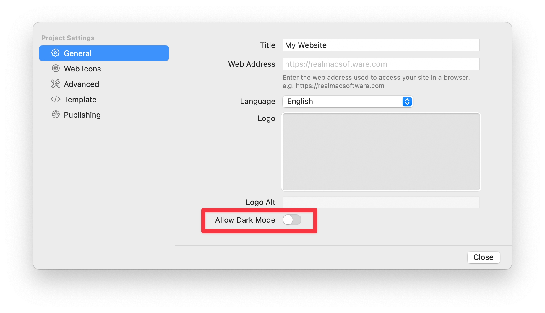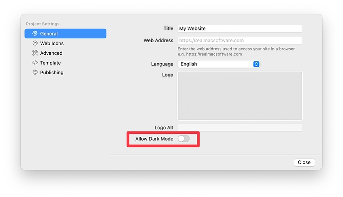 If you don’t want dark mode on your website, you can switch this off in the Project Settings. Please note, this will hide the UI option to toggle between dark and light mode, and only preview and export the light mode version of your website.