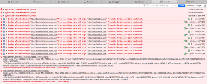 OK, I removed the FB content. Now there are no errors in the error console. However, a very weird thing. On the Media page, I replaced a BlogTalkRadio player (with their code) with an Audio 2 stack, but the stack doesn’t load properly in Safari or Firefox. In Chrome, it does. In Chrome, you can see two audio players, one on top of the other, the top for “Independent Artists & Thinkers” and the bottom for “Interviews of Traci L. Slatton.” However, in Safari and Firefox, it just comes across as black dots. Any thoughts? This is an Audio 2 stack by Yuzool.