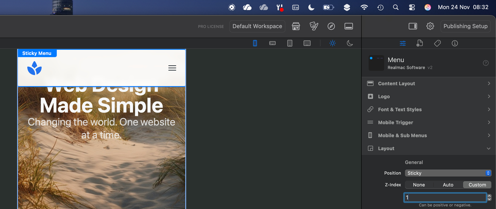 I have just done a simple sticky menu and hero I attach 4 pics desktop/mobile 2 each one with -1 and with +1 z index to show how it works. Just a second thought do you have an outer wrapper (container) on your site with header and menu in or out? Hope this helps?