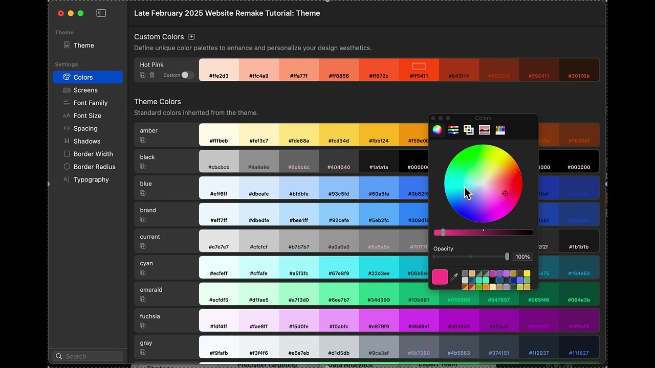 I followed along to the new tutorial right up to the point where I clicked the custom color plus button at the top of the color theme settings. Once I clicked that a new bar of colors came up on the screen in an orange just like your example on the screen.